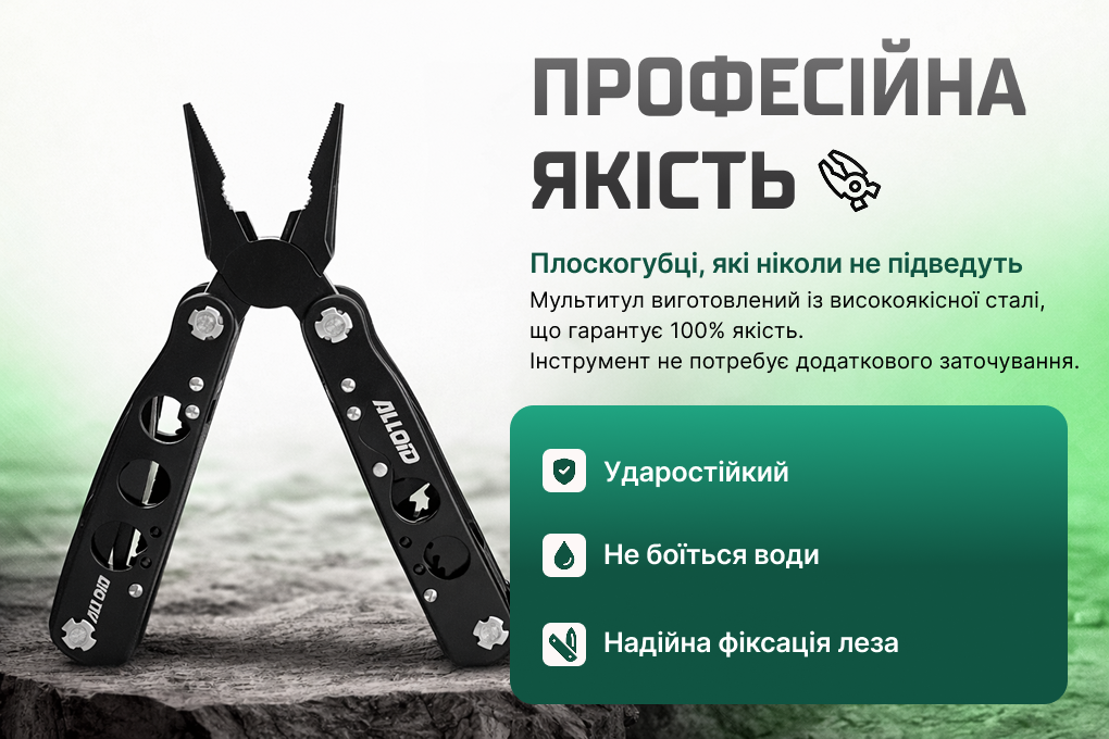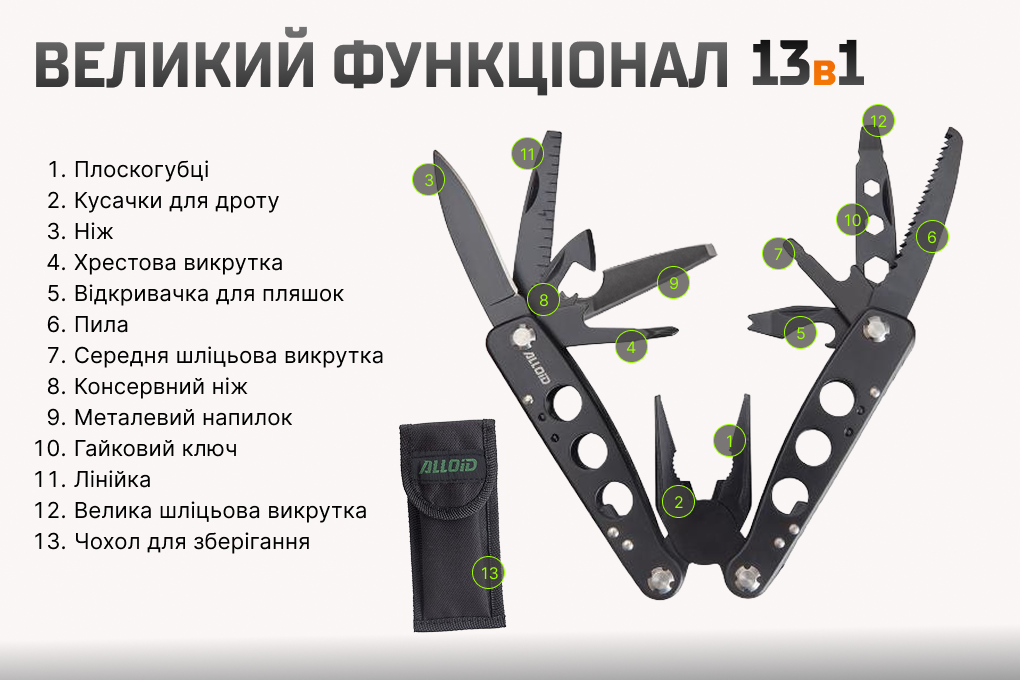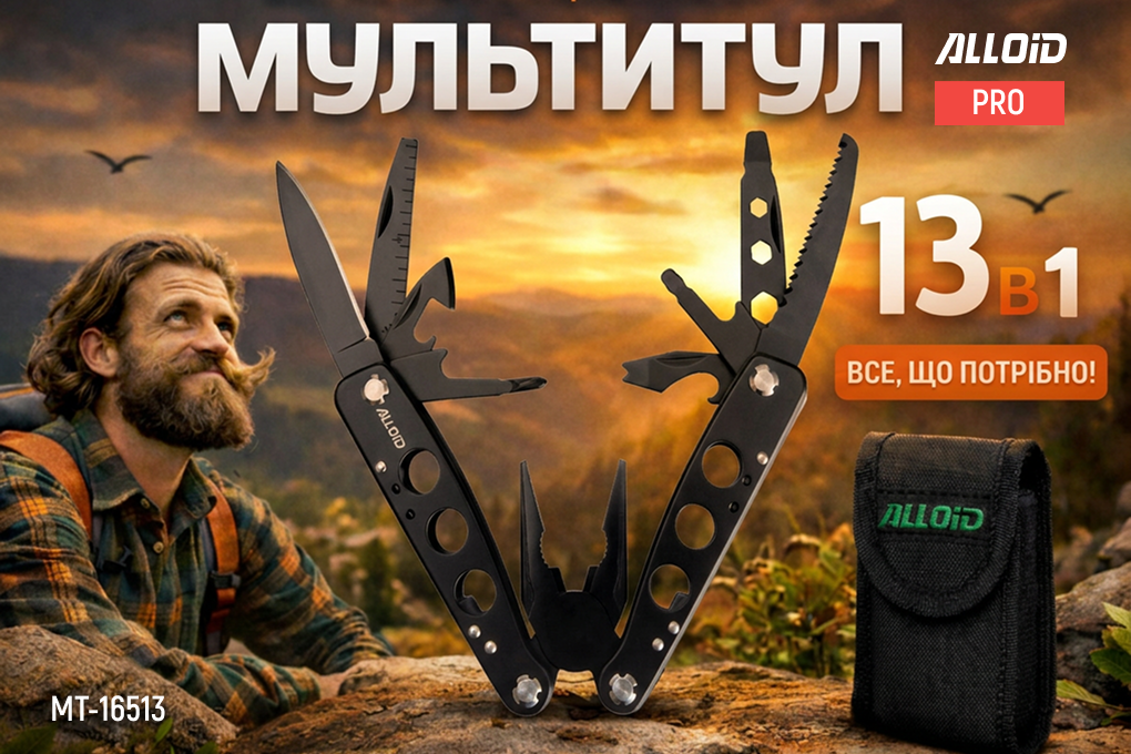 Мультитул Alloid Pro 13 в 1 — практичний багатофункціональний інструмент для щоденного використання, ремонту та активного відпочинку. Компактний формат дозволяє завжди мати його під рукою — вдома, в авто або в подорожі.