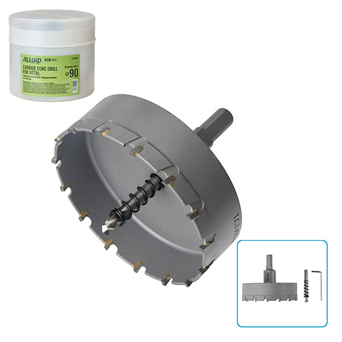 Alloid Base — корончате твердосплавне свердло по металу Ø90 мм, призначене для швидкого та точного свердління металів підвищеної твердості. Завдяки спеціальній геометрії різальної частини та твердосплавним напайкам інструмент забезпечує чистий отвір без деформації матеріалу.